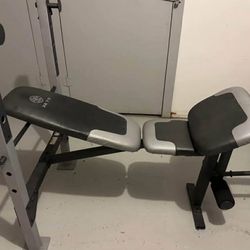 COMPETITOR. OLYMPIC WEIGHT BENCH LEG EXTENSION ADJUSTABLE INCLINE AND BAR HEIGHT. 7' 45LB BAR WITH CLIPS. 2 GOLD'S GYM 45LB PLATES