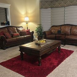 Ashley Furniture; 3 Brown Leather Couches, 2 Brown Accent Chairs, Marble And Wood Table And One Side Brown Coffee Table.$750Plainfield, IL