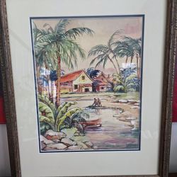 Watercolor on silk painting depicting a tropical village scene with palm trees and pathway, signed by artist Talbot$280Willowbrook, IL