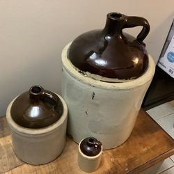 3 Vintage stoneware crock jugs. One is a 5 gallon with a few flaws and the other is a 2 gallon jug and one small 4” one all one price Smaller is ap$25Plainfield, IL