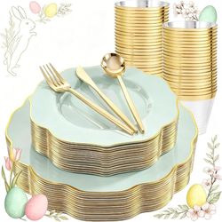bUCLA 180PCS Green Plastic Plates - Disposable Sage Green with Gold Rim - Include 30 (Dinner & Dessert) Plates, 30 Knives, 30 Forks, 30 Spoons and 30 $25Buffalo Grove, IL