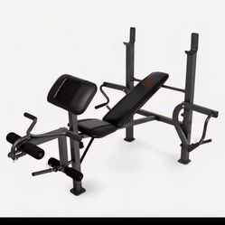 OLYMPIC WEIGHT BENCH LEG EXTENSION ADJUSTABLE INCLINE AND BAR HEIGHT. 7' 45LB BAR WITH CLIPS