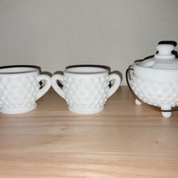 Hobnail White Milk Glass Creamer, Open Sugar and Mustard Kettle $35Davenport, IA