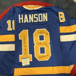 Hanson Brothers X3 Signed Chiefs Blue Jersey Slapshot Puttin On The Foil Beckett$340Roselle, IL