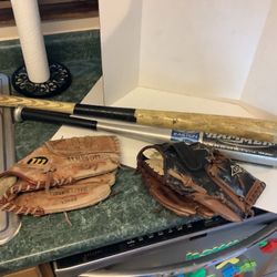 Older baseball equipment 2 bats and 2 gloves. Still life left in them Wilson baseball glove size 11” Franklin 11 baseball glove One wooden baseball b$25Joliet, IL