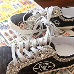 Unique/new, Las Vegas Raiders Women Black Sneakers Shoes w/Silver Glitter Trim Size (6) firm$70Zion, Illinois