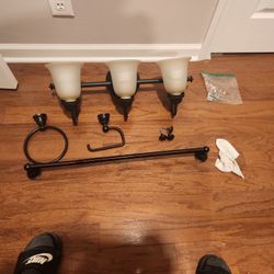 Brushed Bronze Bathroom Light, Toilet Paper Holder, Towel Bar, Wash Cloth Ring Holder, and 3 Vanity Knobs.$40Romeoville, IL