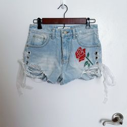 Blue lace up style denim shorts with rose embroidery$15Hoffman Estates, IL