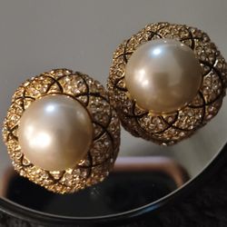 Vintage Ciner Faux Pearl Cabochon Black Enamel & Crystal Gold Plated Oversized Button Clip Earrings ZZ5$80Bensenville, IL