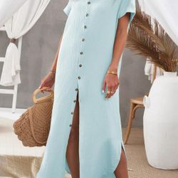 Womens Casual Short Sleeve Button Down Dress Side Split Long Kimonos Cardigans Swimsuit Cover Ups Beach Dress