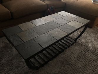 Wood coffee table with stone elements ( safe for hot cups) and weels.$65Downers Grove, IL