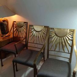 Sunburst Glazed Iron Gold Leaf Chairs. Black & Gold Stripe Covers. Set of 3.