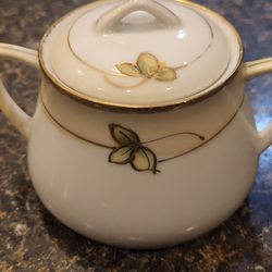Sugar dish white porcelain green leaf two handles with lid $10Janesville, WI