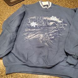 Women XL Morning Sun winter cabin scene blue crewneck sweatshirt, excellent condition Lot 143$4Janesville, WI