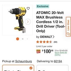 ATOMIC 20-Volt MAX Brushless Cordless 1/2 in. Drill Driver$85Hoffman Estates, IL