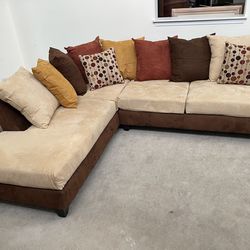 2pc Brown, Beige & Mustard Upholstered Pillow Back Sectional Chaise Sofa$300Bolingbrook, IL