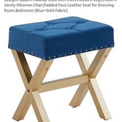 Lasigeli Square Makeup Stool with Rivets Wood X-Legs,Modern Vanity Ottoman Chair,Padded Faux Leather Seat for Dressing Room,Bathroom (Blue+Gold Fabric$45Chicago, IL
