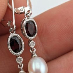 Elegant pair of 14k white gold Garnet, Diamond, and Pearl drop earrings. $299Chicago, IL