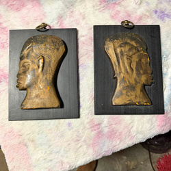 This item is a pair of vintage hand-carved African wall plaques depicting profiles of human heads on wooden backings.$20South Bend, IN