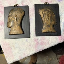 This is a vintage weighted brass gold Egyptian Queen Nefertiti bust figurine on a wooden plaque. $20South Bend, IN