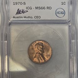 1970 S Lincoln Memorial Cent ICG MS66 RD (RARE) AUSTIN HUTTO SIGNED1970 S Lincoln$120Warren Park, IN