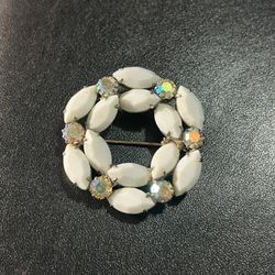 1950s White Milk Glass & Aurora Borealis Rhinestone Wreath Brooch$30Avon, IN