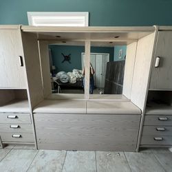 Oak Wall Bed…5-piece has R & L Towers, Center Head Board, Mirror and Light Bridge, adjustable metal bed frame Queen/Full sz.$800Indianapolis, IN