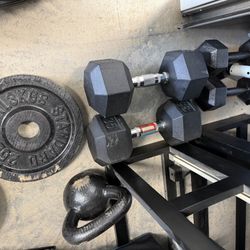 Home Gym Weights Bundle – Dumbbells, 25lb Plates & Kettlebell$75Pretty Praire, KS