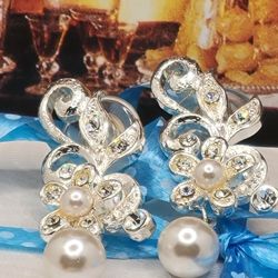 VINTAGE CULTURED PEARLS &, CRYSTAL EARRINGS, 1.5"INCHES LONG A BEAUTIFUL FLOWER STYLE WITH CRYSTALS AND PEARL, SILVER TONE, EXCELLENT CONDITION #1149