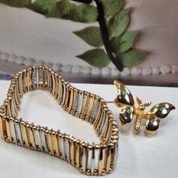 Unique style Vintage Set, 10k Gold Plated , Brooch & Earrings, Filigree , Beautiful colors matching with gold.#713