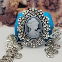 CARVED CAMEO SET OF 2 ITEMS, VERY BEAUTIFUL SET OF CRYSTAL BROOCH 2.5"INCHES LONG & EARRINGS 2.5"INCHES LONG, BROOCH NEW WITH OUT TAG #1148