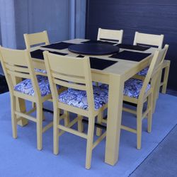Refurbished 6 Chair Yellow Black 54” Square Dining Hightop 36” Table Set W/ Removable Lazy Susan Leaf Bonus Side Bench/Buffet Table Seat 9 Pieces$800Glendale, OH