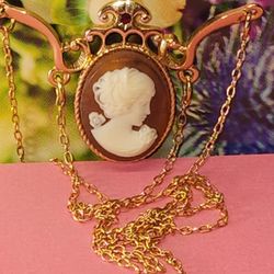 #1847, VTG 1960's CAMEO signed SC NECKLACES, GOLD PLATED, GARNET STONE. 8"IN