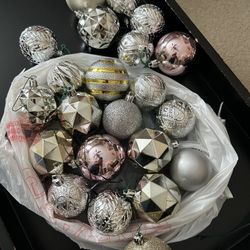 Set of blue Christmas decorations including 2 cloth trees, 6 ornaments, vase w/battery mini lights, 2 heavy acrylic bead stems Trees 10 inch, 7 inch,$15Lexington, KY