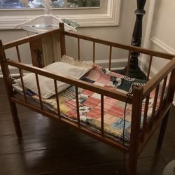 Vintage 90 year old Wooden Doll Bed, vintage quilt, and pillow 23.5”L x 15W x 17.5 T -side lets down picture of juggling clown at the head$75Lexington, KY