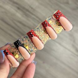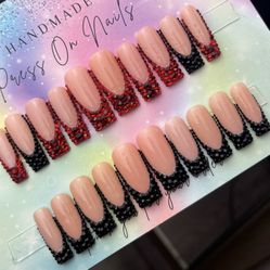 Long and medium square press on nails black red French tip rhinestones$207Beaumont, TX
