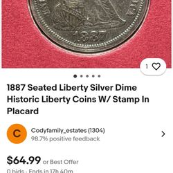1887 Seated Liberty π½ Silver Dime Historical Liberty Coin w/ Stamp In Placard$120Boston, MA