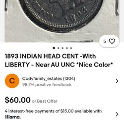 1893 INDIAN HEAD CENT Full Liberty π½- Near AU UNC *Nice Color*$65Boston, MA