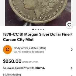 1878-CC $1 Morgan Silver Dollar Fine F Carson City π Mint VG$350Boston, MA