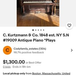 C. Kurtzmann & Co. 1848 Est. N.Y Serian # 19009 Antique Piano $1,500Boston, MA