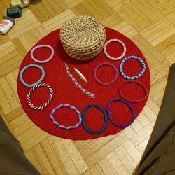 Woven Jewelry Basket With 11 Bracelets And A Pin.$10Spfld (long), MA