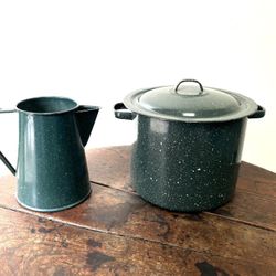 Pair of Enamel Camp Cookware. Green Pitcher and Stew Pot With Lid$14West Somerville, MA