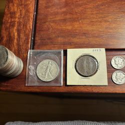 Coin Collection(19 Kennedy Half Dollars, 1946 Walking Liberty 1/2 Dollar, 1853 One Cent Coin, 4 Mercury Dimes 1942$100Avon, MA