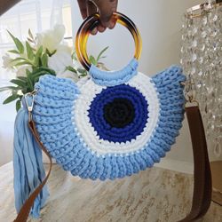 Handmade Evil Eye Crochet Bag • Boho Round Handbag with Tortoise Handles • Teal Tassel Purse • Crossbody & Handbag • Unique Gift for Women$60Baltimore, MD