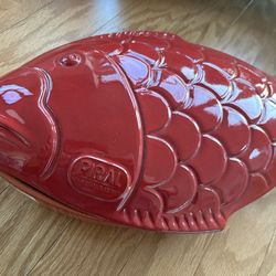 ceramic dish from France, likely produced in the 1940s, featuring a bold red glaze and designed in a fish shape for cooking, baking, serving or as a d$80Reston, VA