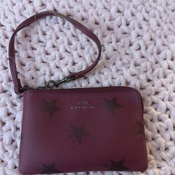 Coach small wristlet used. Few stains please see pictures. 6.5” wide by 4” tall. Color beige and pink. Some shimmering pink accents. Comes from a smok$15Sully Station, VA
