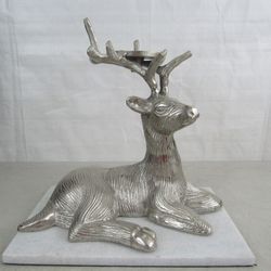 Deer Sitting Statue Heavy Cast Metal Candle Holder On Marble Base 12" Tall