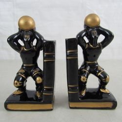 Vtg Ceramic Basketball Player Bookends With Pencil Holder. Circa 1950s