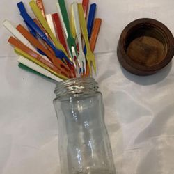 Vintage Pickettes Plastic Cocktail Forks In Glass Jar With Wooden Lid 4” Tall$15Gaithersburg, MD