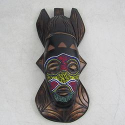 African Hand Carved Wooden Folk Art Tribal Beaded Mask Wall Decor